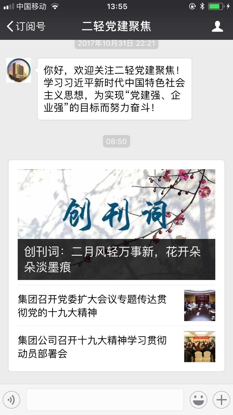 加強黨建工作宣傳有利于統(tǒng)一集團(tuán)上下思想、凝聚黨員群眾力量、傳播企業(yè)文化。在集團(tuán)領(lǐng)導(dǎo)的高度重視和悉心指導(dǎo)下,微信公眾號《二輕黨建聚焦》正式上線運行,請二輕全體員工關(guān)注、閱讀、轉(zhuǎn)發(fā)公眾號推送的文章,積極向公眾號投稿或留言,通過全體二輕人共同的關(guān)心和參與,使其成為數(shù)字信息時代集團(tuán)黨委的喉舌、黨建宣傳的窗口。