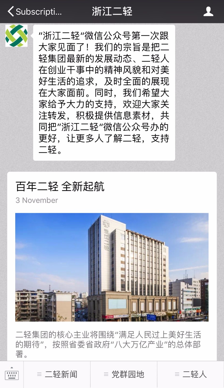 ”浙江二輕“微信公眾號第一次跟大家見面了!我們的宗旨是把二輕集團最新的發(fā)展動態(tài)、二輕人在創(chuàng)業(yè)干事中的精神風貌和對美好生活的追求,及時全面的展現(xiàn)在大家面前。同時,我們希望大家給予大力的支持,歡迎大家關注轉(zhuǎn)發(fā),積極提供信息素材,共同把”浙江二輕“微信公眾號辦的更好,讓更多人了解二輕,支持二輕。