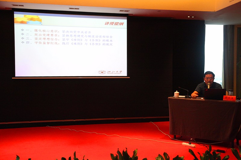 段治文教授從強(qiáng)化核心意識(shí)、突出黨建要求、堅(jiān)定理想信念和守住監(jiān)督紅線四個(gè)方面生動(dòng)細(xì)致地解讀了習(xí)近平總書記系列重要講話精神和治國理政新理念新思想新戰(zhàn)略。他首先提到,必須強(qiáng)化核心意識(shí),即堅(jiān)決向黨中央看齊?!耙粋€(gè)國家,一個(gè)政黨,領(lǐng)導(dǎo)核心至關(guān)重要”,為了推進(jìn)全面從嚴(yán)治黨,需要一個(gè)核心領(lǐng)導(dǎo)者,而這個(gè)領(lǐng)導(dǎo)者就是習(xí)近平總書記。要理解習(xí)近平總書記治國理政新理念新思想新戰(zhàn)略,首先要從理解“中國夢(mèng)”開始。所謂“中國夢(mèng)”就是指實(shí)現(xiàn)中華民族的偉大復(fù)興。段治文說,一定要堅(jiān)持思想建黨與制度治黨相結(jié)合?!凹t船精神”是中國共產(chǎn)黨建黨過程中首創(chuàng)、奮斗、奉獻(xiàn)精神的象征,更是黨與人民關(guān)系的有力體現(xiàn),學(xué)習(xí)和弘揚(yáng)“紅船精神”就是思想建黨;完善規(guī)范、健全制度、扎緊制度籠子,則是解決矛盾與問題的要點(diǎn),學(xué)習(xí)和牢守黨章黨規(guī)就是制度治黨。段教授強(qiáng)調(diào),共產(chǎn)黨員要堅(jiān)守《準(zhǔn)則》與《條例》的規(guī)定,絕不做腳踩紅線、失掉底線的事。
